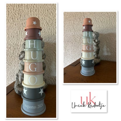 Stapeltoren in vrolijke pasteltinten. De toren bestaat uit 8 bekers en kan voorzien worden van naam en geboortedatum.