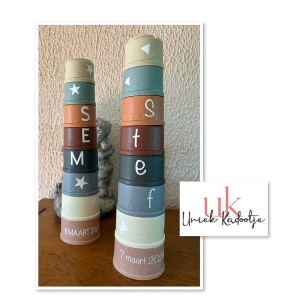 Stapeltoren in vrolijke pasteltinten. De toren bestaat uit 8 bekers en kan voorzien worden van naam en geboortedatum.