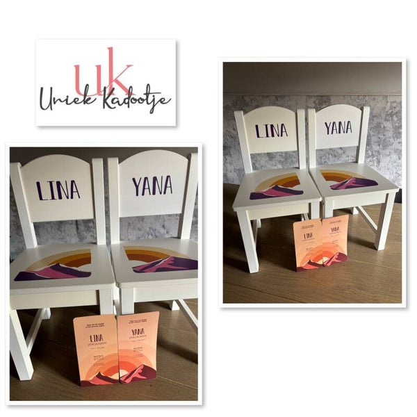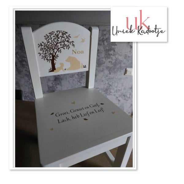 Het stoeltje is wit van kleur en kan bestickerd worden met tekst en/of afbeelding. Vaak wordt hierbij gebruik gemaakt van delen van een geboortekaartje.