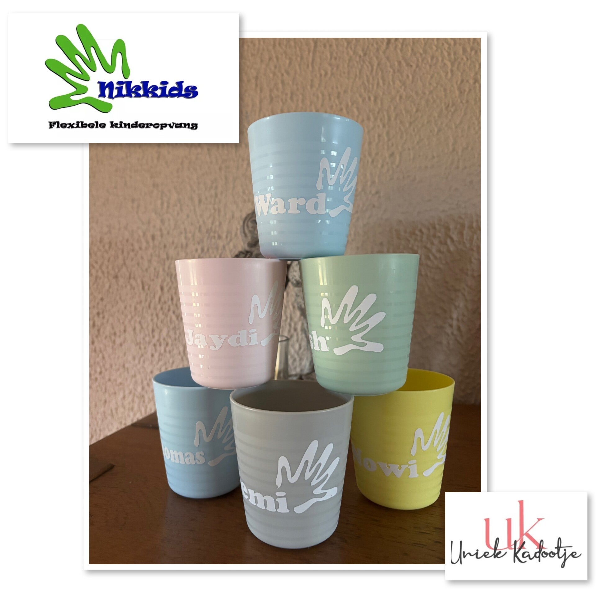 Kunststof herbruikbare drinkbeker, verkrijgbaar in pasteltinten. Op de beker kan een tekst bestickerd worden met eventueel een kleine afbeelding.