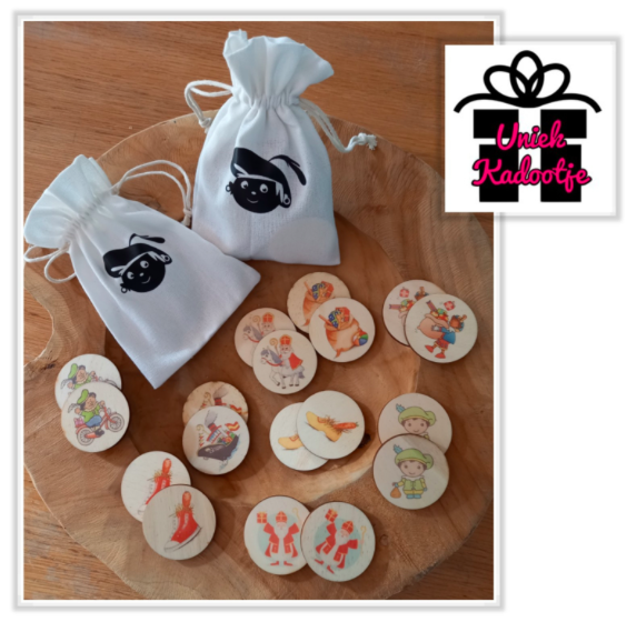 Het memory-spel bestaat uit 18 houten schijfjes (9 paar) in het thema van Sint en Piet. Het spel zit in een witte katoenen zakje (12x17 cm). Op het zakje (met trekkoord) staat een pietje, hieronder kan een naam gedrukt worden.