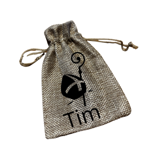 Jute zakje van 15 x 20 cm groot met naam. De naam wordt in het zwart op het zakje gedrukt.
